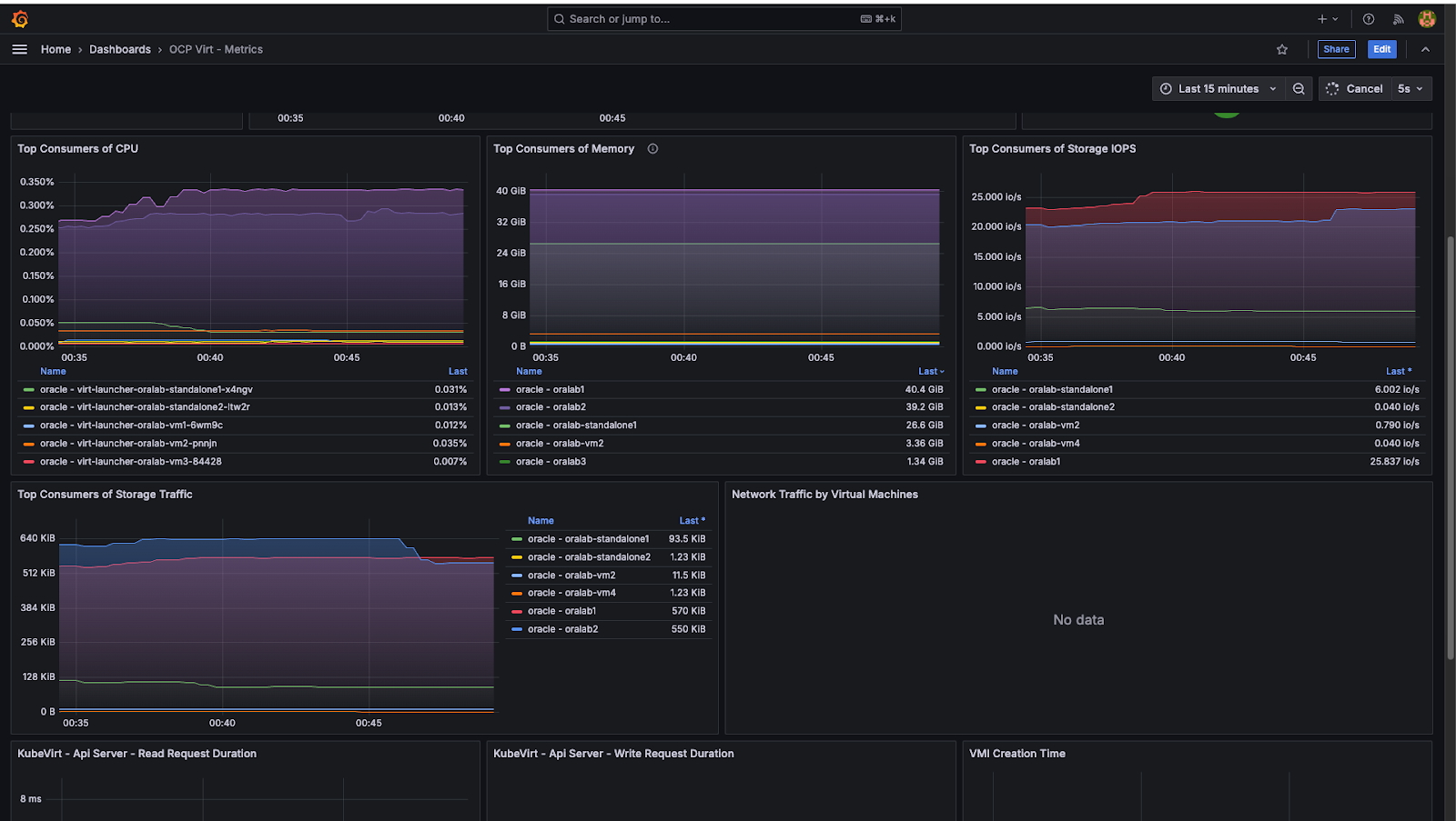Figure 5 shows a sample Grafana dashboard deployed as part of the observability and monitoring setup for the OpenShift Virtualization platform.