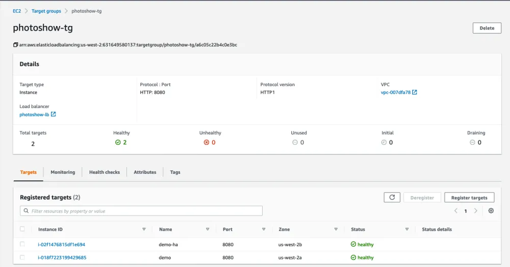 The Application Load Balancer forwards the requests to the Target group that includes the two EC2 instances hosting our application containers.