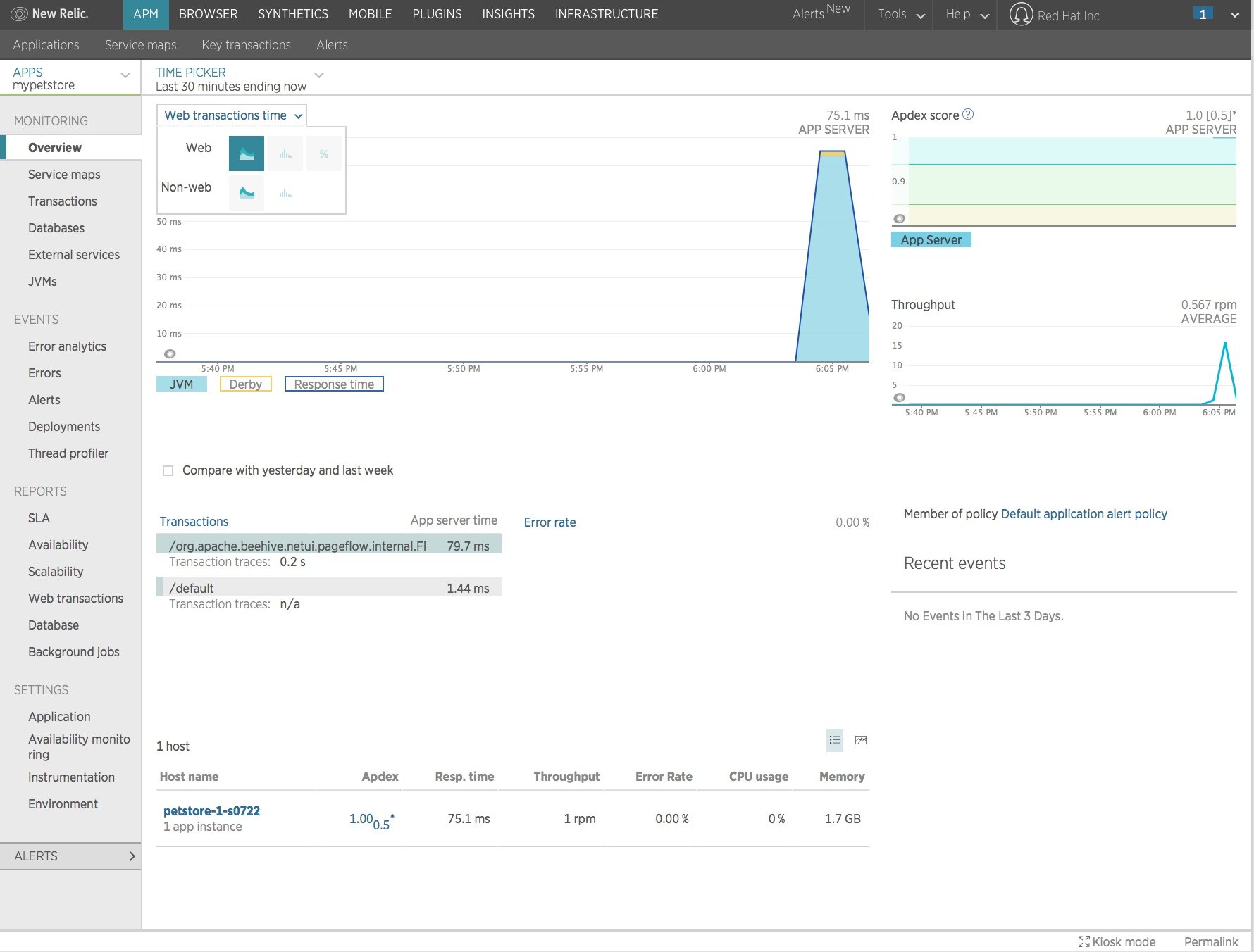 Now go to your New Relic Console. Go to New Relic APM. You should find your application with the name you configured for NEWRELIC_APPNAME. In my case that is configured as mypetstoreabove. Click on the application name and you should start seeing the transaction data as shown below.