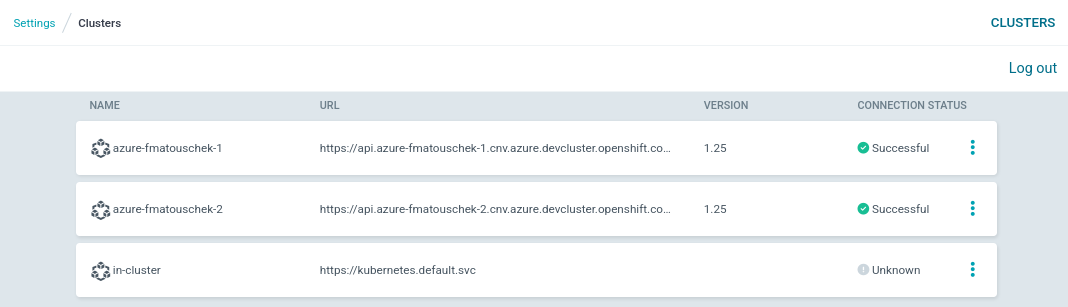 In this screenshot you can see that the managed clusters were made available to ArgoCD successfully. This view can be opened by going to ArgoCD's settings and opening the Clusters menu. Until an Application is deployed to the cluster its connection status may still be Unknown.