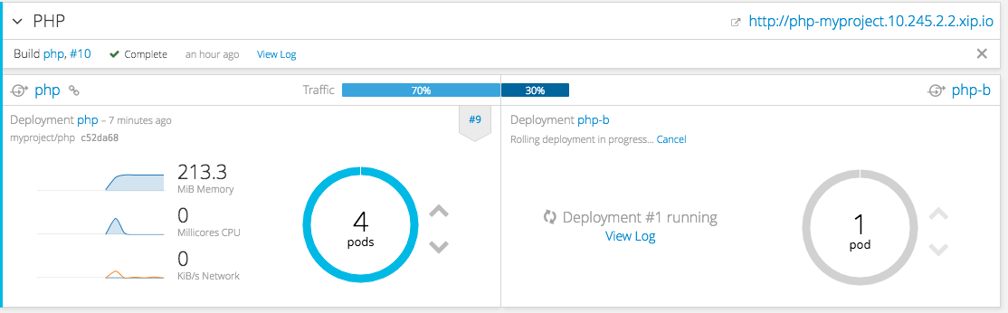 Running or recently completed pipeline builds will also show up on the new overview if they are related to a deployment configuration.