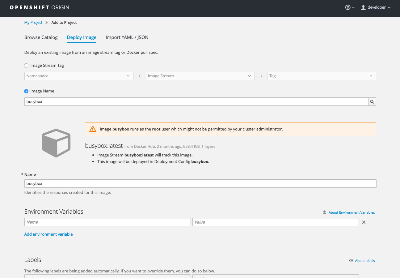 The ‘Add to Project’ page now has two new options, the first of these is Deploy Image. If you’ve used ‘oc run’ before then this behavior will feel similar. For those that haven’t, it lets you pick any existing image or tag from an image stream, or to look for an image using a docker pull spec. Once you’ve picked an image it will generate the service, deployment configuration, and an image stream if it’s from a pull spec.