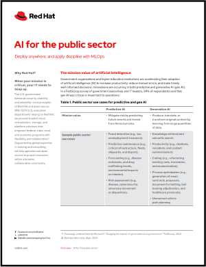 Discover how organizations in the public sector can leverage Red Hat OpenShift AI for optimized resource management, scaling, and model maintenance. Red Hat® OpenShift® AI optimizes artificial intelligence (AI) resource management, scales to meet workload demands, and maintains AI models. Learn more about AI-enabled applications in the public sector.