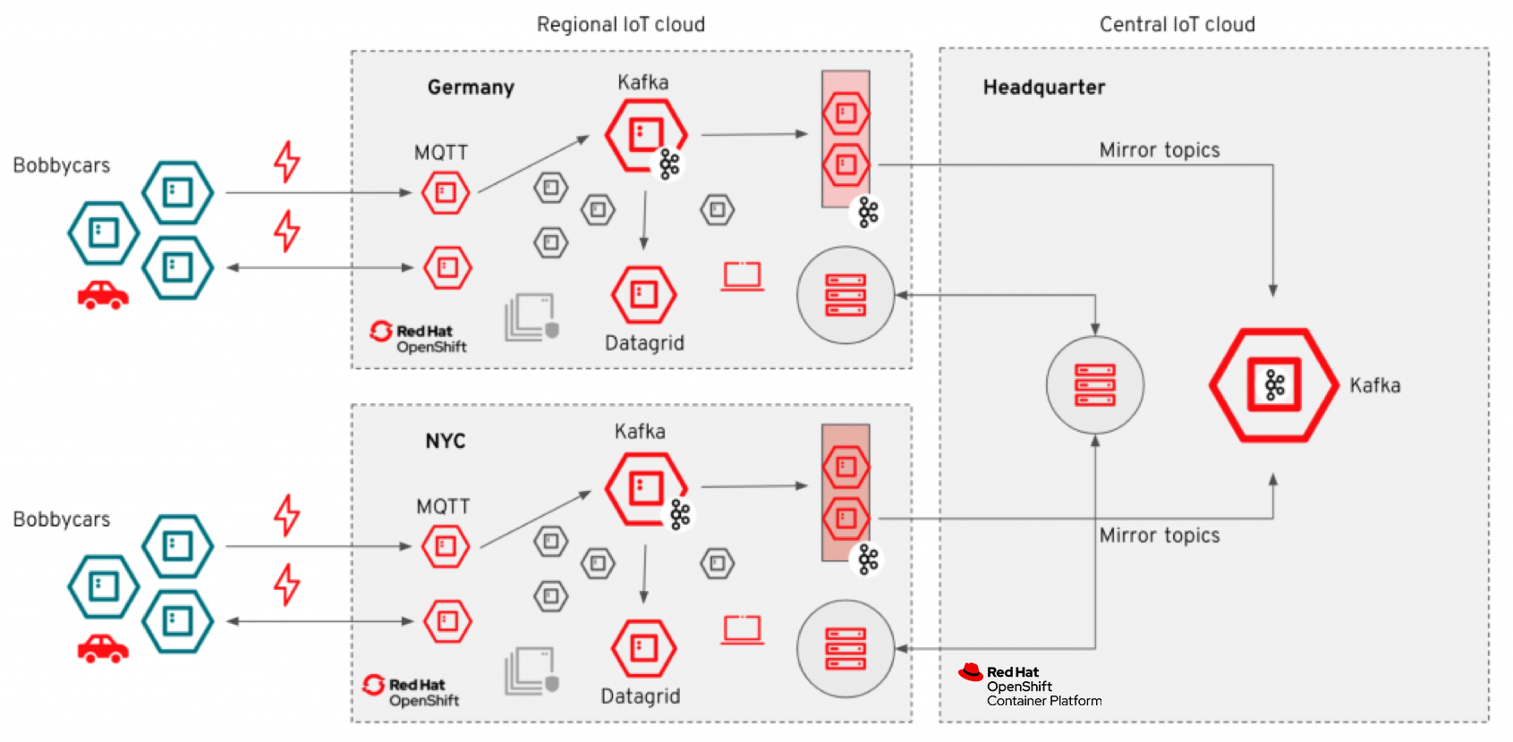 - Bobbycars: Bobbycars are vehicle simulators implemented in Quarkus (cloud-native Java™ stack) that simulate vehicles (connected cars) and send telemetry data to a regional IoT cloud backend. In this demo they represent the vehicle edge.