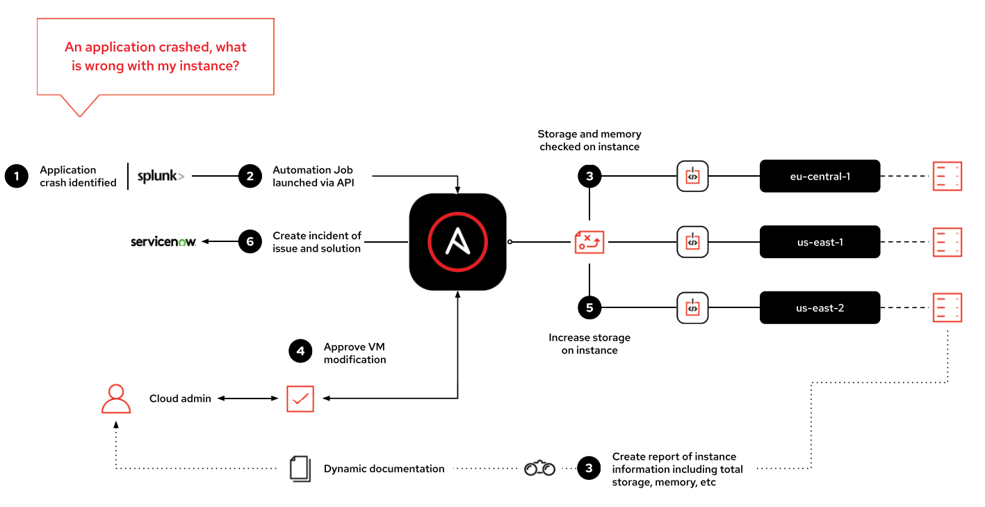 A wide range of components can also be automated through Ansible Automation Platform. One common integration is with IT service management (ITSM) consoles. When an automation script identifies an incident, it can automatically open an ITSM ticket and add all the details about the instance into the ticket.
