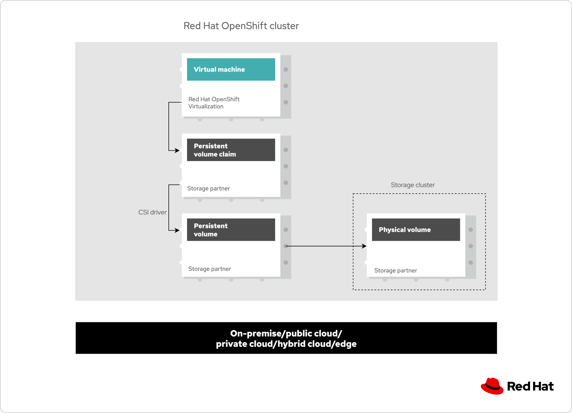 Red Hat OpenShift allows underlying storage (physical volumes) to be presented to VMs as Kubernetes persistent volumes, which are provisioned storage resources in the cluster. The container storage interface (CSI) provides the API to configure and manage these physical volumes, and the storage partners deliver their drivers. Data can be mutually stored on the storage cluster—running a partner storage solution—and in the Red Hat OpenShift cluster.