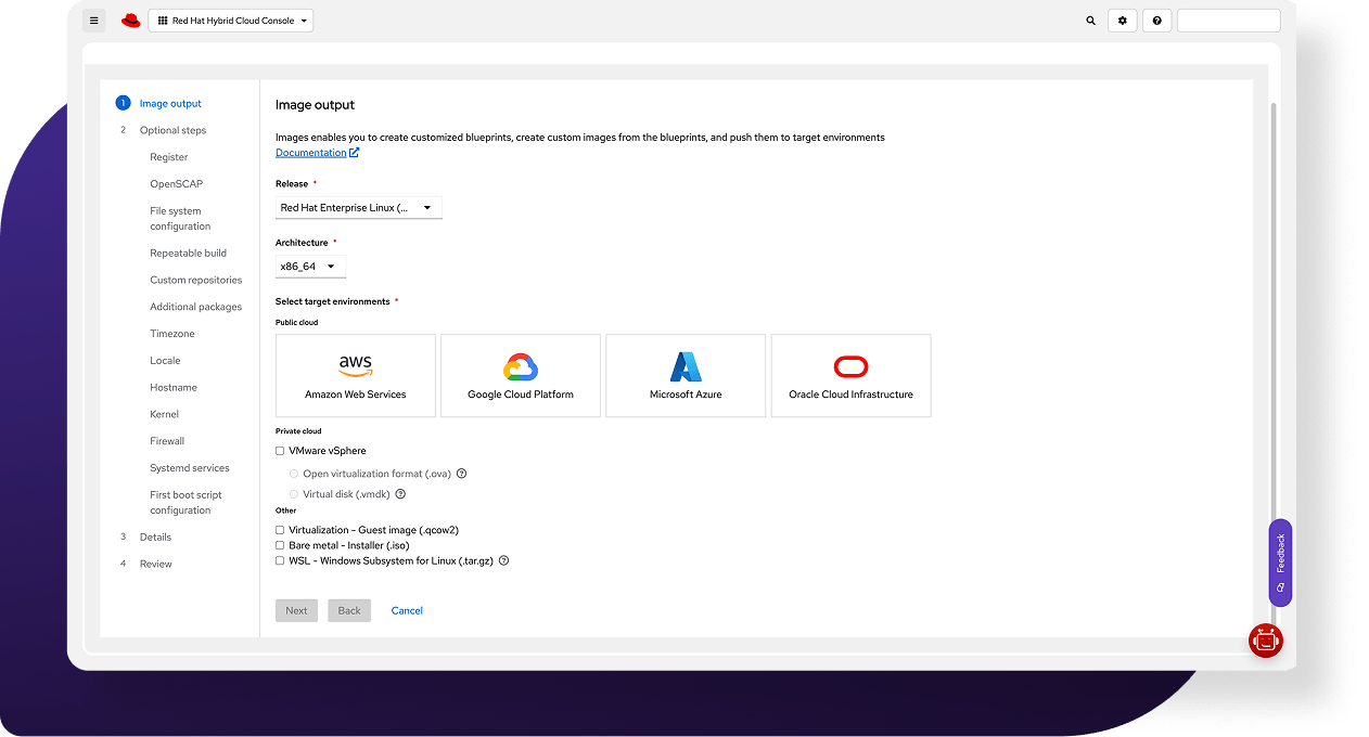 Use package recommendations in the Red Hat Lightspeed image builder to create customized system images for virtual machines, cloud-based instances, and more. Image builder is also compatible with virtualization technologies and major cloud providers to help meet your operational requirements. With real-time monitoring, you’ll know instantly when configurations deviate from your standard operating environment (SOE), helping you reduce drift and establish a more consistent, predictable environment.