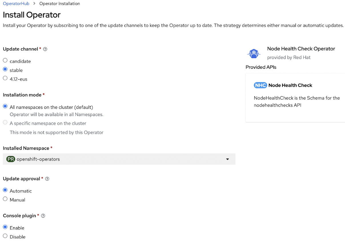 Log in to your cluster’s web console as a cluster administrator → OperatorHub → search Node Health Check → install
