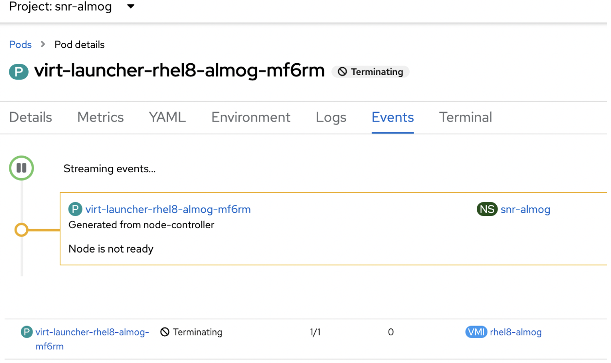 Once the virt launcher pod status will be ‘Running’, the VM is ‘Running’ on another node.