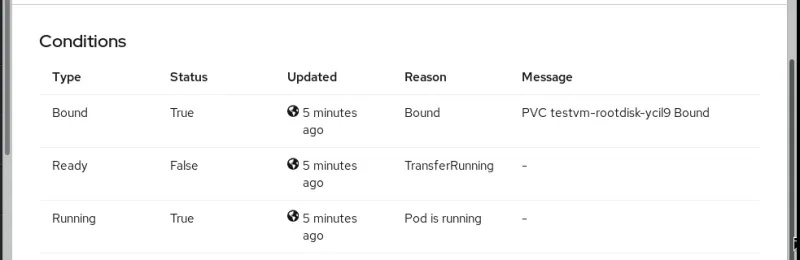 Scroll down to see its conditions. They show that the DataVolume got a PVC and it is running a pod to perform the transfer of the qcow2 image to the volume.