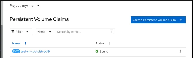 Click Storage → Persistent Volume Claims to list all PVCs in the myvms project.