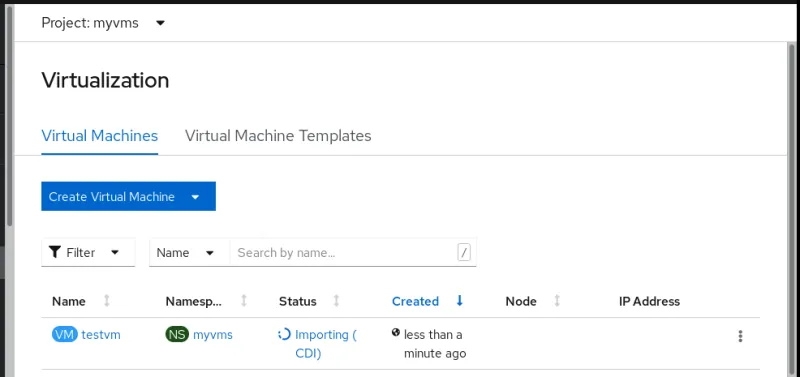 The web console is back to Workloads → Virtualization, in the Virtual Machines tab. You should see your testvm virtual machine with a status of “importing,” which means that OpenShift is downloading the source image and creating a root disk for your VM.