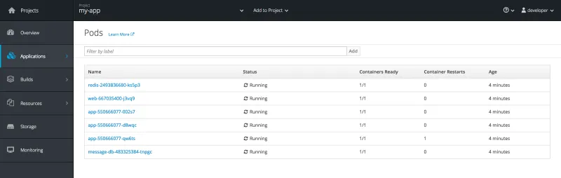 I have signed into the OpenShift web console and selected Applications -> Pods. Below are the pods making up my simple microservices application. It consists of:
