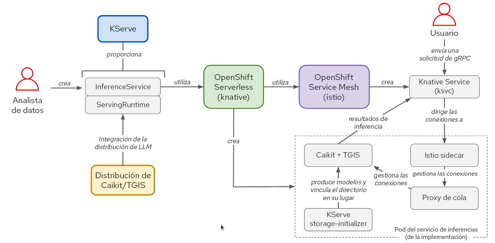 KServe ofrece muchas funciones de servicio de vanguardia para la inferencia de modelos de inteligencia artificial al aprovechar OpenShift Serverless y OpenShift Service Mesh. Estos elementos concentran la complejidad relacionada con las redes, la configuración del servicio, el ajuste automático y la comprobación del estado para la distribución de modelos de producción.