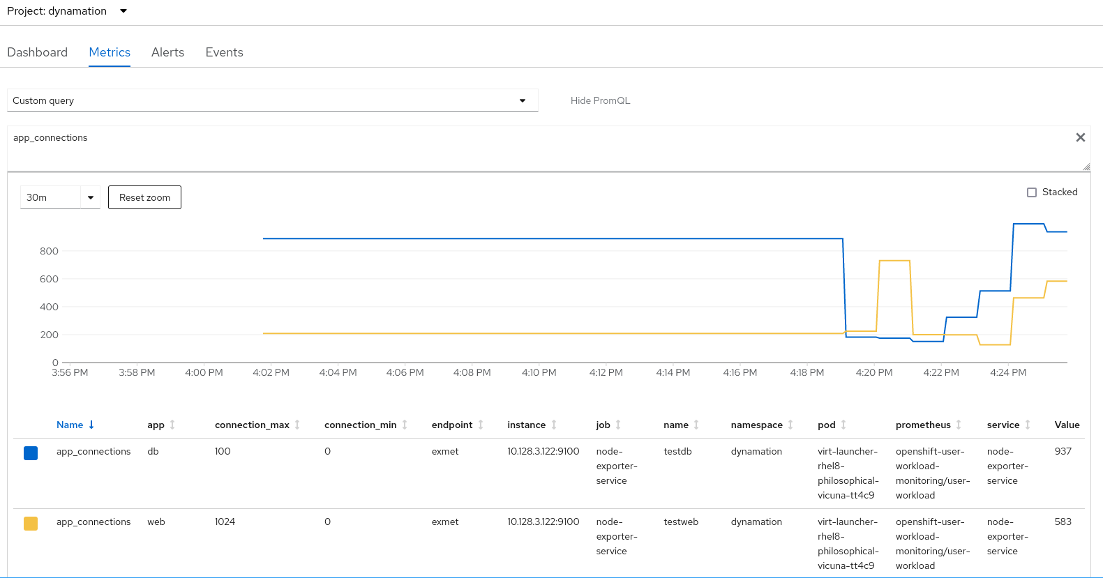 The metrics can be easily queried using the GUI interface. I am logged in as the rayh user and viewing the dynamation project namespace. I am in the Developer view.