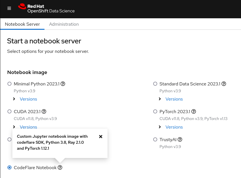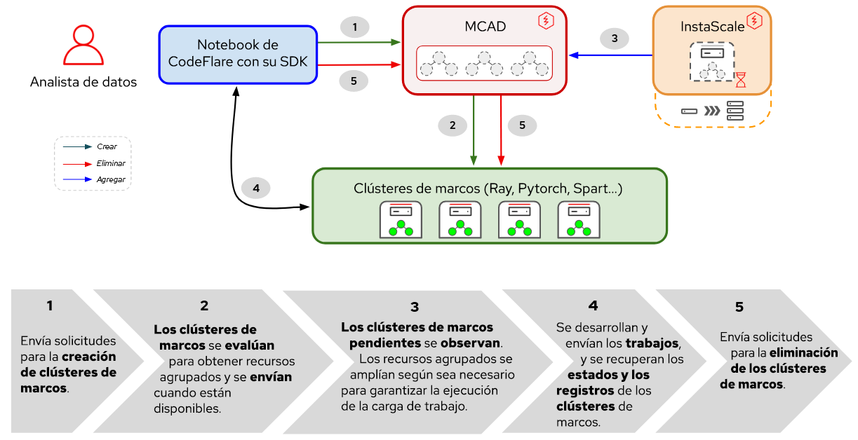 - CodeFlare-SDK: es una herramienta para definir y controlar la infraestructura y los trabajos informáticos distribuidos remotos. El operador CodeFlare implementa un notebook con CodeFlare-SDK.