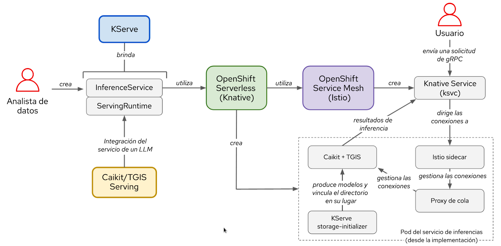 Figura 2. Interacciones entre los elementos y el flujo de trabajo del usuario en la stack de KServe/Caikit/TGIS.