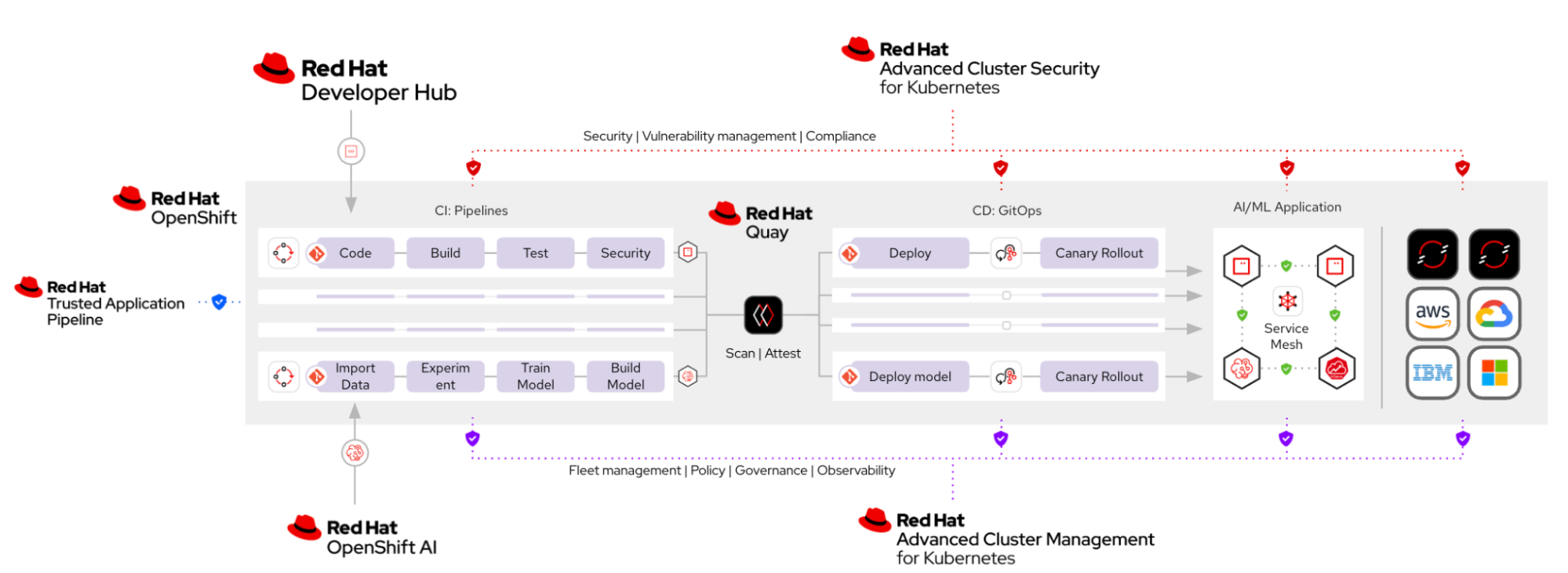 - Red Hat Advanced Cluster Security: Monitors for runtime deviations, unpatched vulnerabilities, or unauthorized privileges in AI workloads.