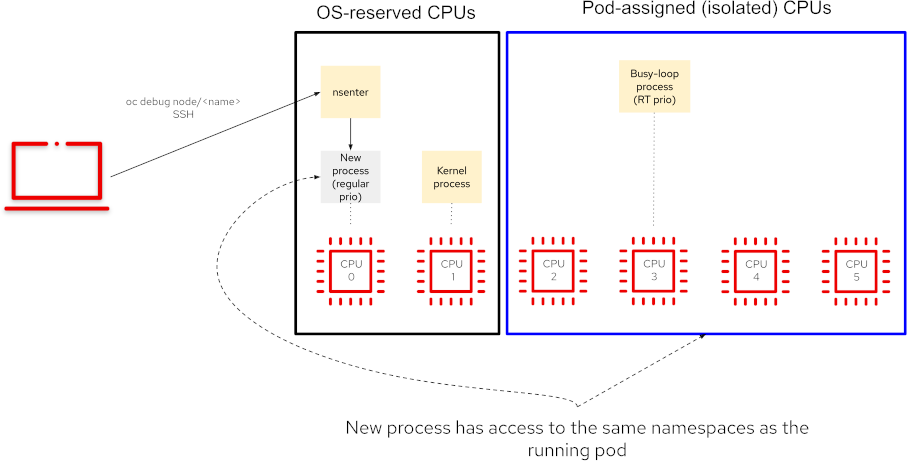 Under the above mentioned configuration, connecting to the container using oc exec poses a potential risk. Thus, we need an alternative that allows us to access the container while running on a separate CPU set. For this purpose, we can use the nsenter utility, included by default with Red Hat Enterprise Linux and Red Hat OpenShift.