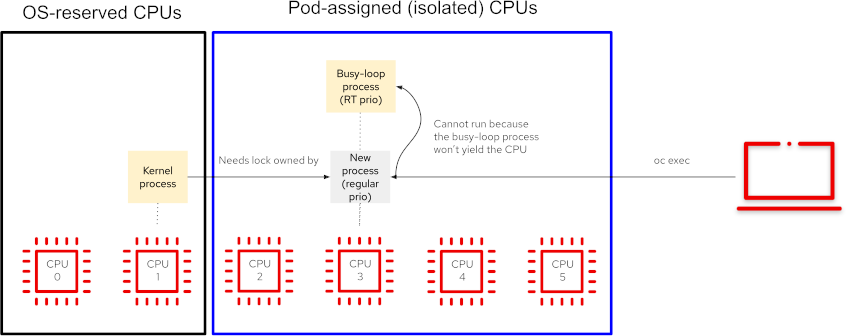 The key to this issue is the fact that, when we enter the pod using oc exec, the new process is only allowed to run on the same set of guaranteed CPUs as the container, without an option to choose on which CPU to run. If the new process is scheduled to run on the same CPU as the busy-loop RT process, there is a risk that it will impact its latency requirements, and in the worst case scenario cause a kernel hang.