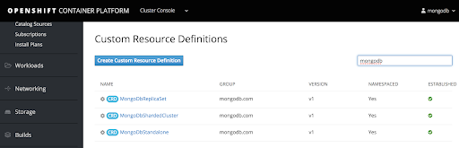 Lets go ahead and click the “Create New” button and choose “MongoDB Replica Set” (one of the three custom resources that are managed by Operator).We get a screen with a YAML file that allows us to configure new instances.At a minimum, we need to give a user-friendly name to the metadata.name field and press “Create”.