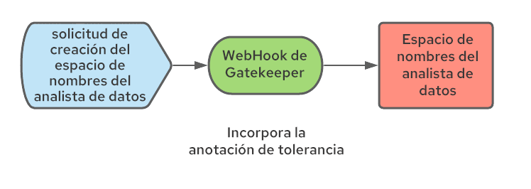 Como mencionamos anteriormente, Kubeflow creará espacios de nombres para los analistas de datos en el primer inicio de sesión de cada uno de ellos. Dado que no controlamos el modo en que se crean los espacios de nombres, se debe implementar un proceso para que se les apliquen las anotaciones correctas. Esto se logra mediante una configuración del webhook de mutación, el cual intercepta la creación de espacios de nombres y agrega las anotaciones necesarias. Usamos Open Policy Agent (OPA) y el proyecto Gatekeeper, que integra OPA y Kubernetes, y los implementamos a través del operador de Gatekeeper.