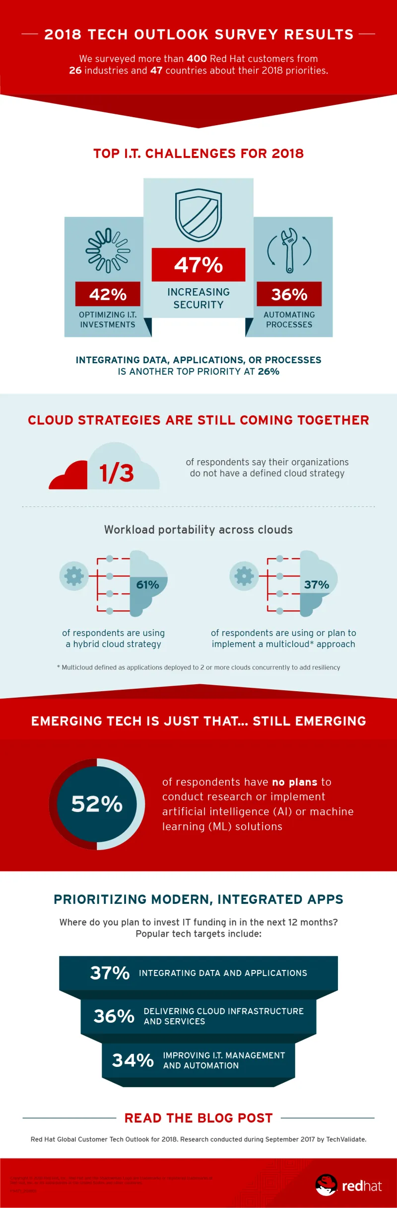 En septiembre de 2017, Red Hat realizó una encuesta por Internet a través de TechValidate a un grupo de clientes sobre sus prioridades y perspectivas tecnológicas con vistas al año 2018. Los encuestados provinieron de todo el planeta y representaban las siguientes regiones: Asia Pacífico, Europa, Oriente Medio, África, América Latina y América del Norte. El mayor porcentaje de encuestados correspondían a empresas grandes y medianas (53,5%); el resto de los encuestados pertenecían a pequeñas empresas (16%); integrantes de la lista Global 500 (10,9%); instituciones educativas (4,9%); gobiernos estatales y locales (4%); integrantes de la lista Fortune 500 (4%); integrantes de la lista S&P 500 (2%); organizaciones de membresía sin fines de lucro y fundaciones (2%); y el gobierno federal (1,8%). Las empresas encuestadas representaban los siguientes sectores: software, hardware y servicios informáticos (19,2%); servicios financieros (10,2%); telecomunicaciones (9,2%); gobierno (7,3%); salud (6,2%); instituciones educativas (6%); energía y servicios públicos (5,7%); comercio minorista (5%); medios de comunicación y entretenimiento (4%); aeroespacial y defensa (3,8%); fabricación industrial (3,6%); electrónica (3,3%); servicios de transporte (3,1%); automotriz y transporte (2,6%); servicios profesionales (2,6%); organizaciones sin fines de lucro, fundaciones y organizaciones de membresía (2,4%); productos y servicios de consumo (1,7%); alimentos y distribución mayorista (0,007%); productos y servicios de seguridad (0,007%); agricultura (0,004%); productos químicos (0,004%); construcción (0,004%); servicios y equipos ambientales (0,004%); metales y minería (0,004%); ingeniería (0,002%); y bienes inmuebles (0,002%).