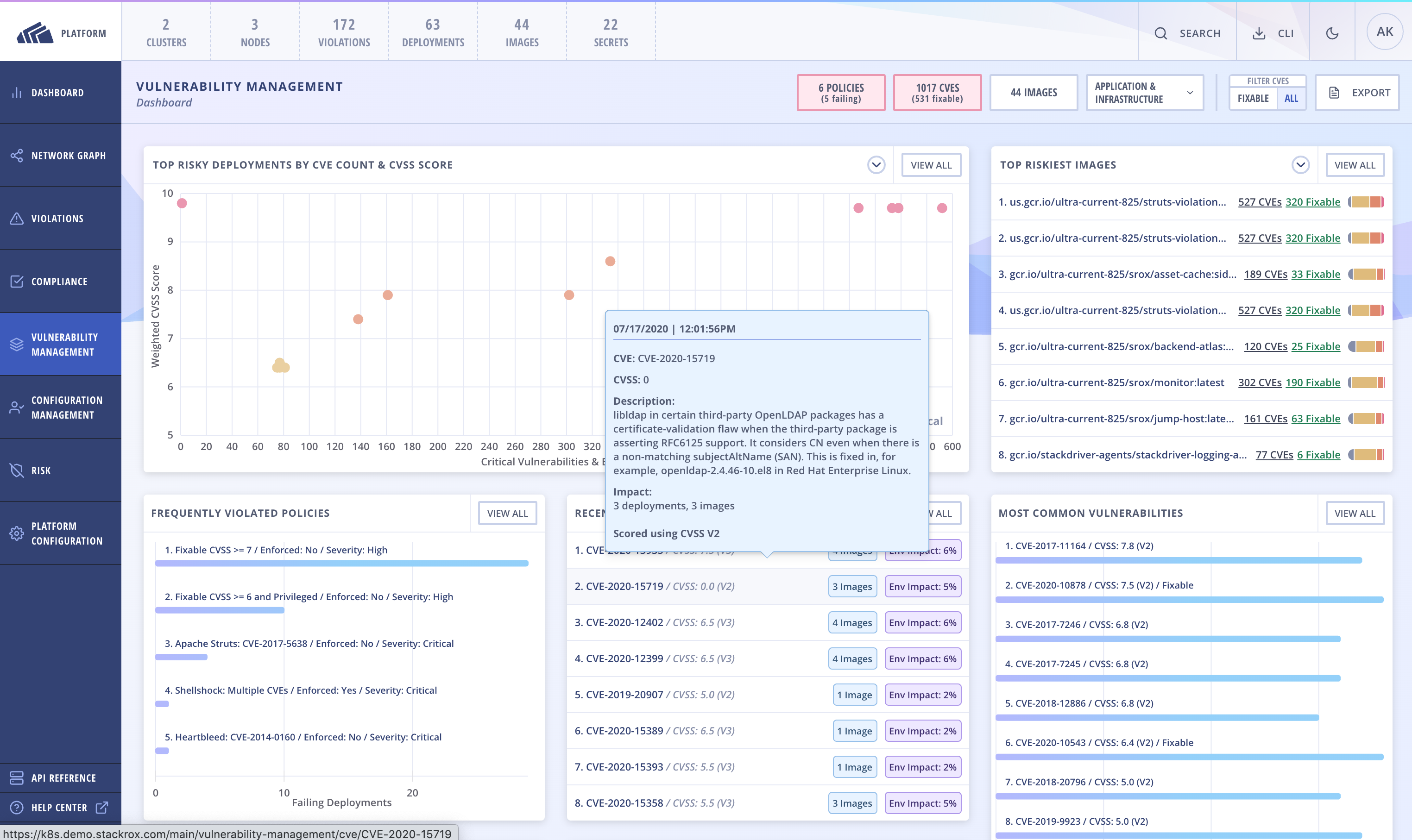 The StackRox platform helps mitigate attacker access to cloud resources with several capabilities. StackRox scans container images for vulnerabilities as they are built and enables users to quickly discover new vulnerabilities in running Kubernetes Deployments.