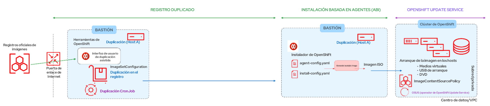 Si el host bastión no tiene conexión a Internet, consulte la sección de la documentación oficial a fin de realizar pasos adicionales para duplicar el conjunto de imágenes en el disco y luego duplicar ese archivo en un dispositivo de duplicación. Estas instrucciones no se incluyen en el artículo.
