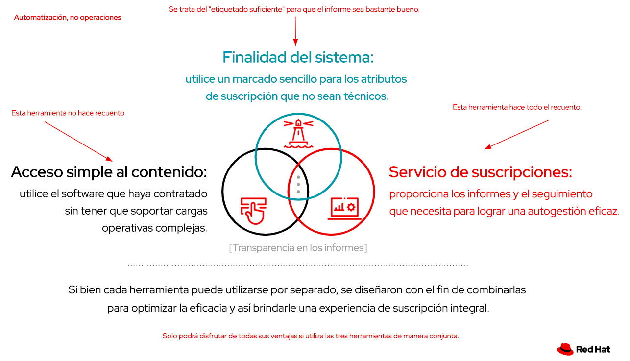 Para hacer frente a esta situación, Red Hat dispone de una serie de herramientas que le permitirán obtener el máximo provecho de sus suscripciones sin necesidad de habilitar cada sistema RHEL de forma manual. Estas son el acceso simple al contenido (SCA), el servicio de suscripción y la finalidad del sistema.