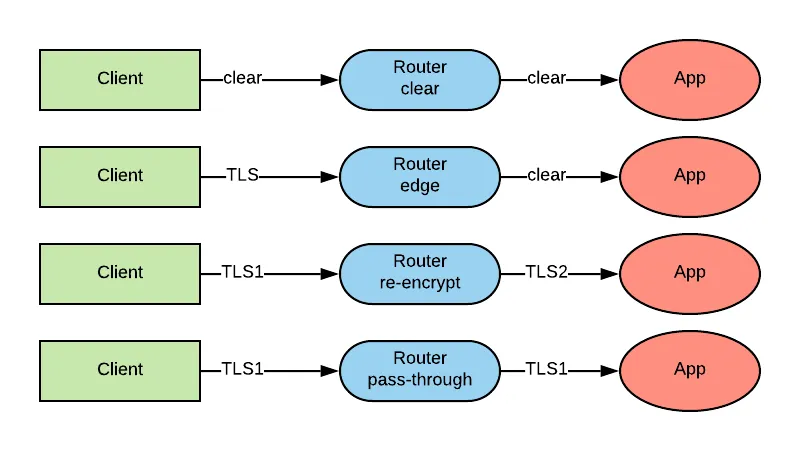- Edge: the connection is encrypted from the client to the reverse proxy, but unencrypted from the reverse proxy to the pod.