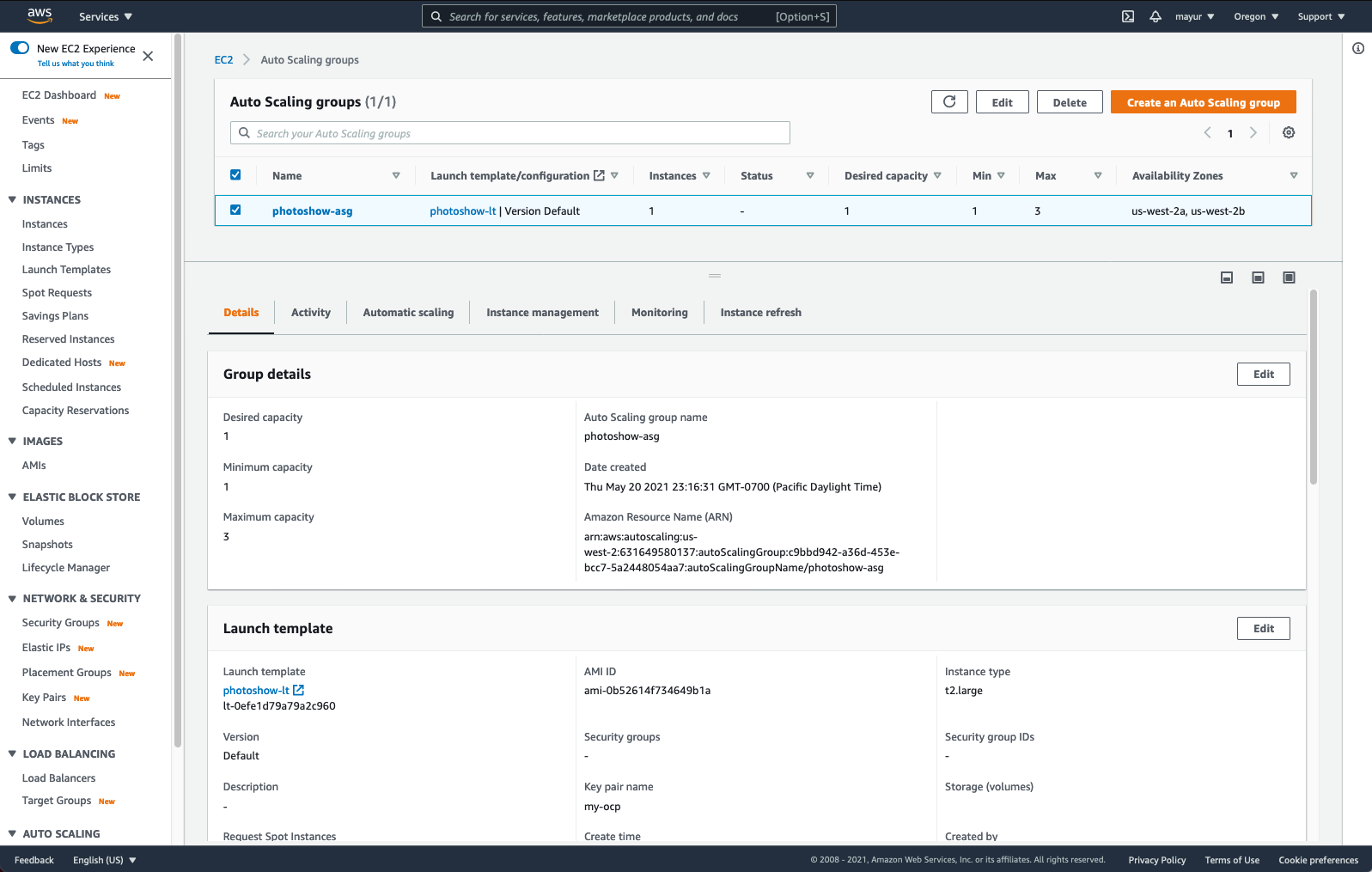 That is exactly where the Auto Scaling comes into picture. I added an Auto Scaling group called photoshow-asg with Desired Capacity of 1, Minimum capacity of 1, and Maximum capacity of 3 to handle any increase in the user requests.