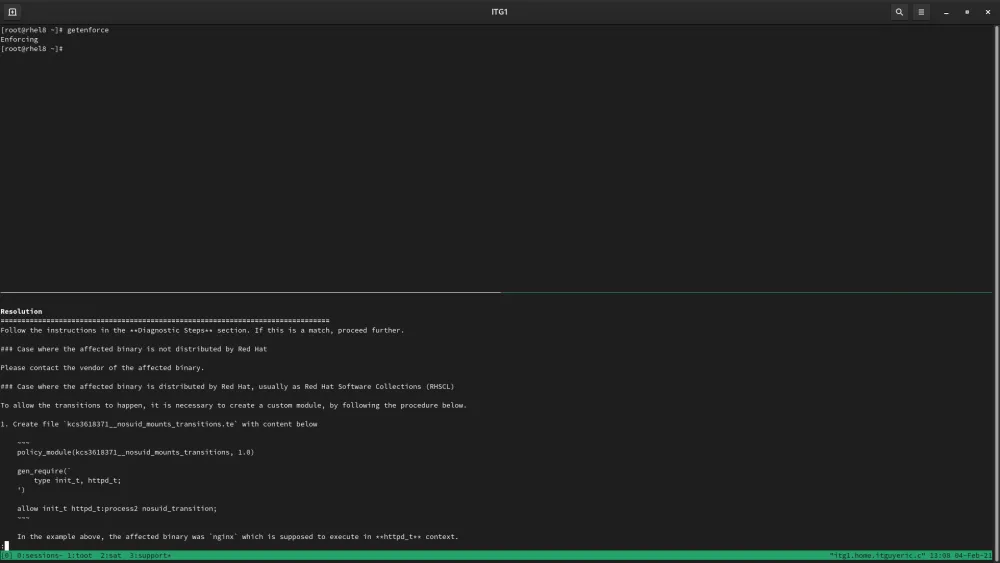 We mentioned configuring Nginx. Let’s see what we can find about Nginx and SELinux. Redhat-support-tool will ask us for our password. I chose not to save mine. This is probably your best bet, especially if your server is in a shared environment. However, if you do want to save your support tool configuration, it's all saved in a configuration file at: