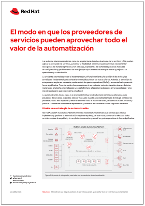 La creciente automatización de la implementación, el funcionamiento y la gestión de las redes y los servicios es fundamental para acelerar la comercialización de las nuevas ofertas. Además, la ejecución de este proceso según sea necesario puede reducir los gastos operativos (OpEx) y aumentar los ingresos de forma significativa. Obtenga más información sobre el modo en que Red Hat® Ansible® Automation Platform brinda funciones totalmente compatibles para los proveedores de servicios.