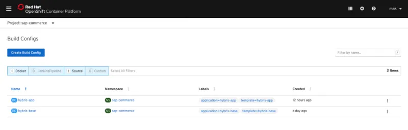 For this post, we’re using OpenShift Container Platform 4.2. To support the build and deploy stages, we are using Nexus and a git server deployed in OpenShift. This procedure can be easily adapted to use any other artifact repository and/or source code management tool. These tools will contain the initial artifacts to build the SAP Commerce base image and the application code that will be deployed on top of that base image. Additionally we are using Secrets and Config Maps that are not part of the templates to store different credentials to login into these systems and allow us to pull in objects.
