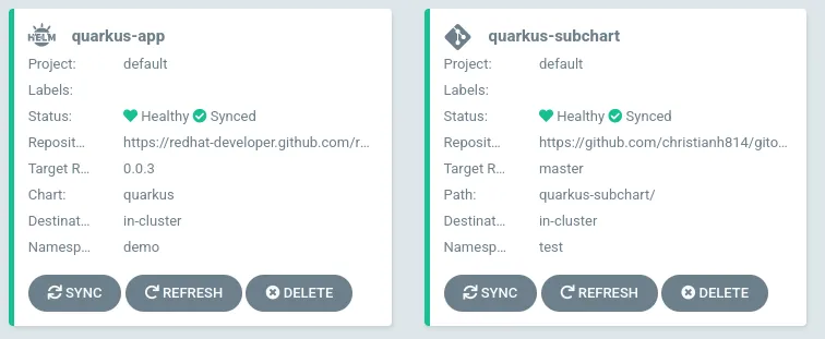 Note the icons in the upper left corner. One registers as a “Helm Application” and the other as a “Git Application”, which just means that the values for my Helm chart come from the Git repo. I can verify this by seeing if my quarkus-subchart application deployed 3 replicas (as it was stated in my values.yaml file).