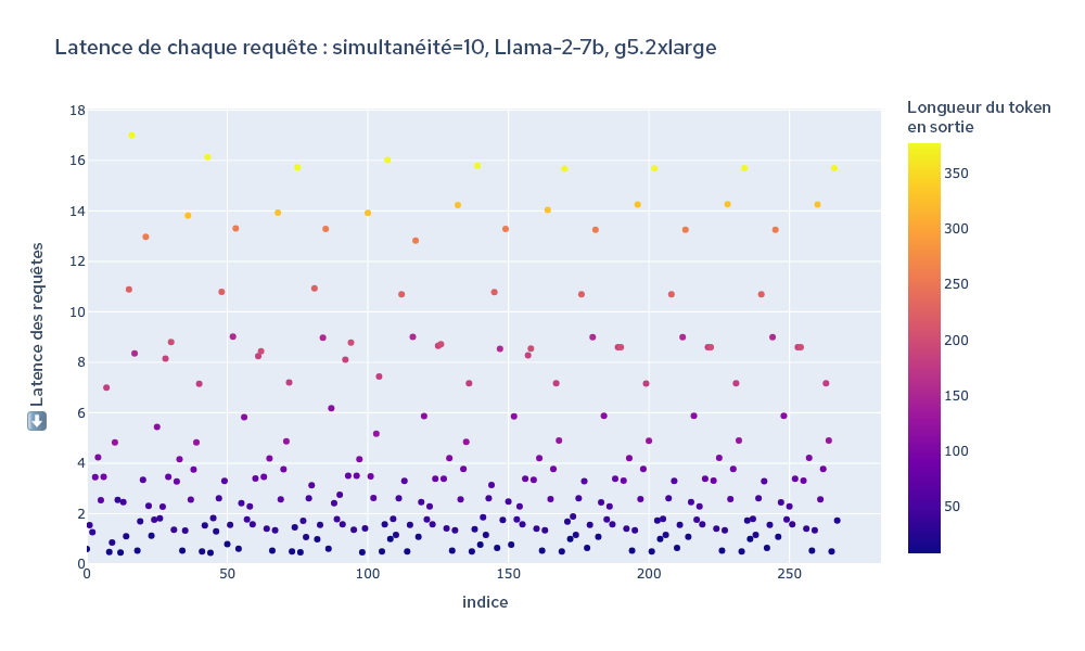 À titre d'illustration, la figure 3 ci-dessous représente la latence totale de chaque requête pendant la durée du test. La couleur de chaque point représente la longueur du token, permettant de voir à quel point sa longueur est étroitement corrélée avec la sortie globale des requêtes.