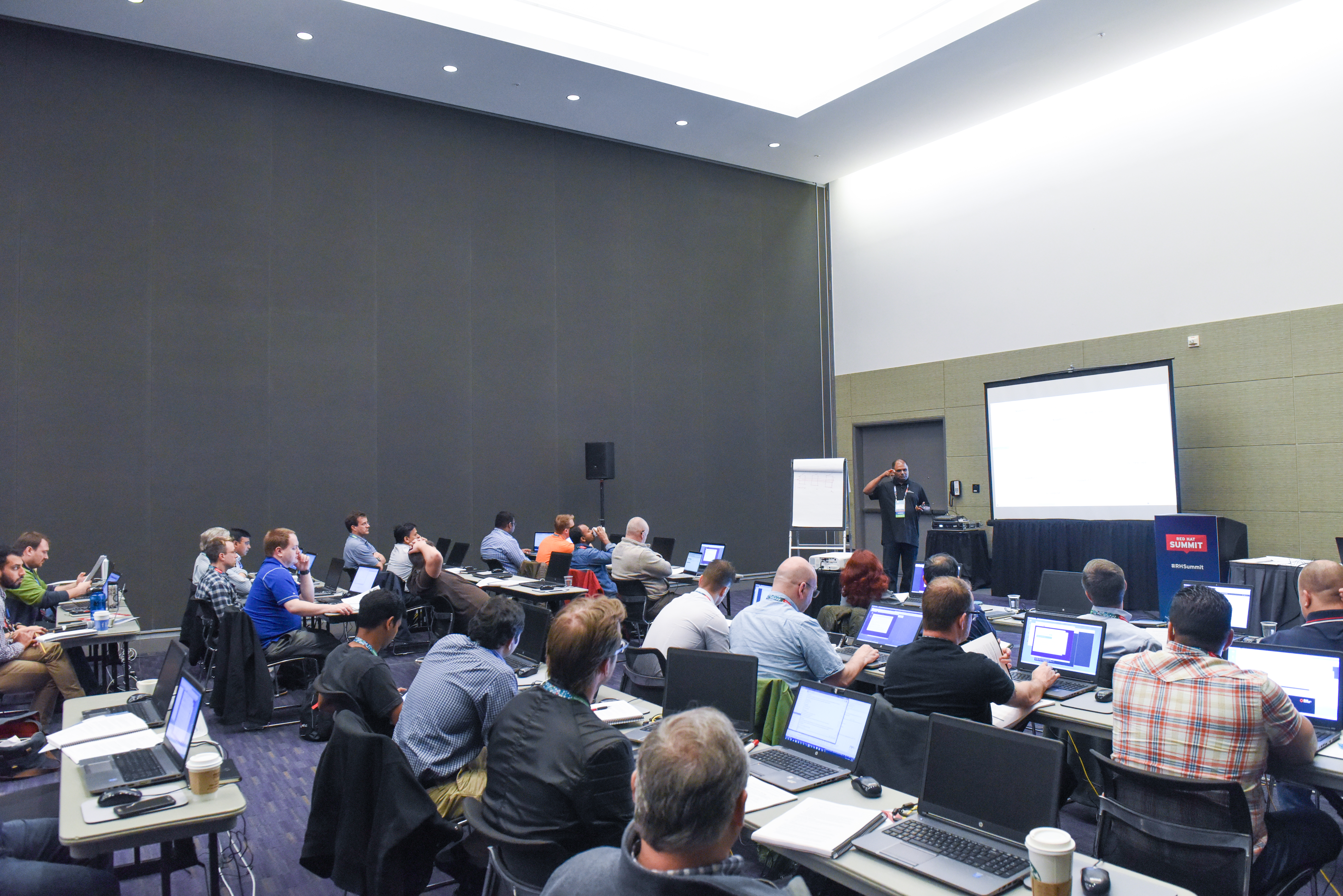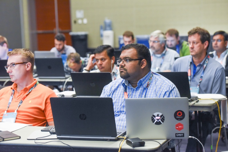 Throughout Summit, we hosted an area with over 100 machines that provided 3 to 7 self-paced labs for 14 courses. Attendees were able to select which labs they were interested in and were then directed to a machine that would host their desired lab. This was a great way to get attendees hands-on with different Red Hat technologies they were interested in.