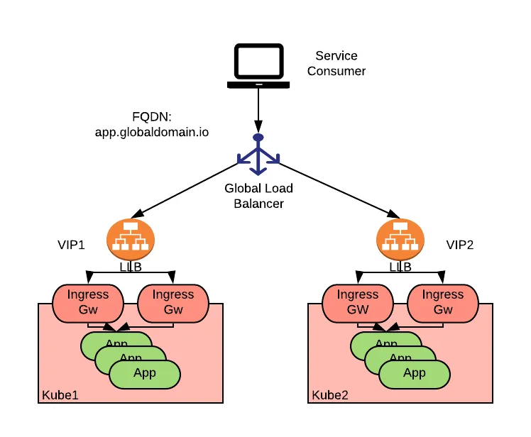 The diagram above depicts an application called “app” deployed to two Kubernetes clusters and accessible via Ingress or Gateway APIs resources (henceforth Ingress for simplicity), which are in turn exposed by two local load balancers (LLB) accessible via two Virtual IP’s (VIPs): VIP1 and VIP2. A global load balancer sits above the LLB’s and directs the consumers to either of the clusters. Consumers reference a single global FQDN (app.globaldomain.io, in this example) to access the application.