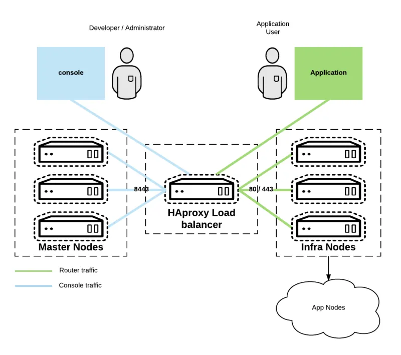 HAproxy load balances port socket connections to a pool of servers, in this case, the OpenShift cluster nodes. The following discusses the process of adding a second HAproxy server to an existing OpenShift deployment. This configures the environment into a highly available cluster using Keepalived. Keepalived is routing software written in C that establishes a floating virtual IP address using Virtual Router Redundancy Protocol (VRRP) that can belong to any node in a cluster. For more information regarding Keepalived: http://www.keepalived.org. In this configuration, there is a backup and master node. After the configuration is deployed and tested, a node failure is simulated. As this failure takes place, the master fails over to the backup. Lastly, the bottom of the page has completed configuration files that can be modified to suit any environment.