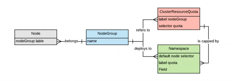 Each tenant project refers to a ClusterResourceQuota and deploys resources to the corresponding nodegroup. Each tenant project must be controlled by one and only one ClusterResourceQuota. The project default node selector must be configured to select the nodes belonging to the node group the ClusterResourceQuota refers to. For example: