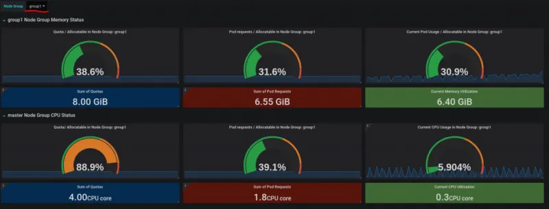 This capacity management dashboard works on a group of nodes and will help deciding if you need more or less nodes for that group. You can have many node groups in your cluster, so the user can select the node group they want to work on with a drop down list box.