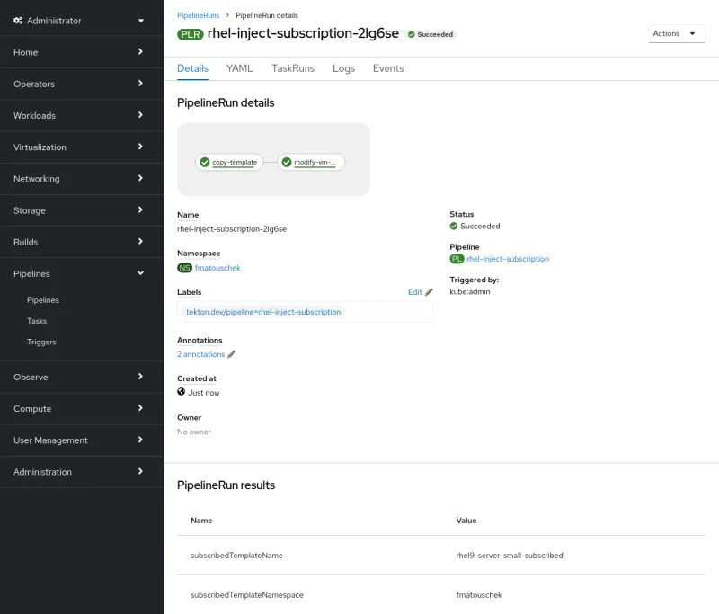 The pipeline will create a new VM template named according to the parameters entered previously and will inject the activation key and organization automatically into the template. In the PipelineRun results the name and namespace of the newly created template will be shown. Already existing templates with the same name will be overwritten by default so the pipeline can be run multiple times to update the credentials-injected template.
