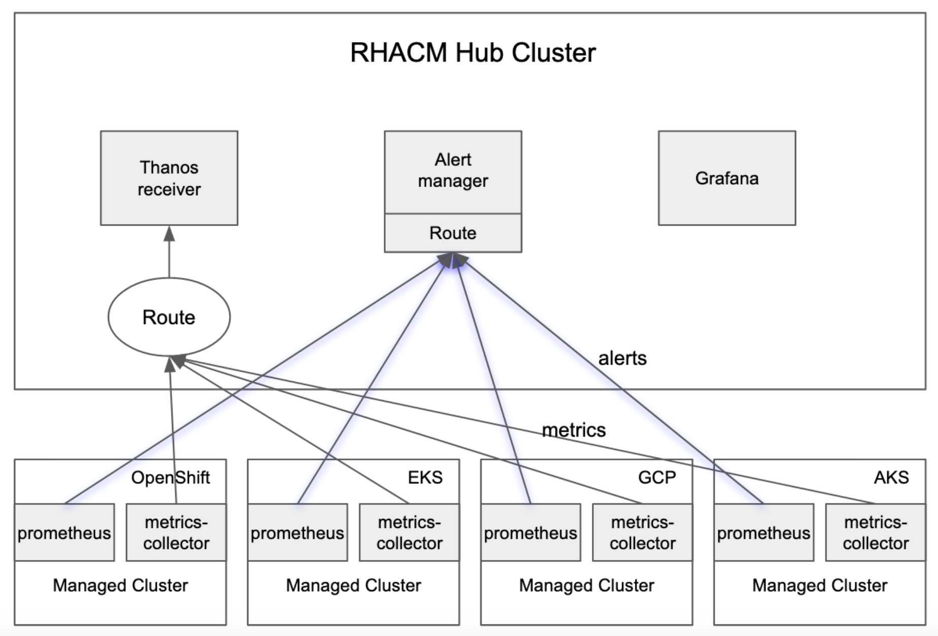 With the observability service enabled, you can use Red Hat Advanced Cluster Management for Kubernetes (RHACM) to gain insight about and optimize your managed clusters. If the managed cluster is Red Hat OpenShift Container Platform (RHOCP) 4.8+ or KS cluster, you can see alerts from all the managed clusters in the hub cluster.