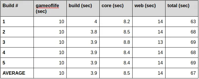 Let’s move on to builds with a pre-populated libraries directory as a result of each of the runs above. Again we’re doing 5 runs and will take the average times.