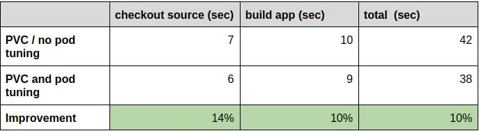 Similar to our previous tests, we run 5 builds without a PV attached to the build pods and 5 with a pre-populated PV. The following tables have the results: