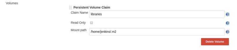Make sure to mount the ‘libraries’ PV to /home/jenkins/.m2 and save your changes.