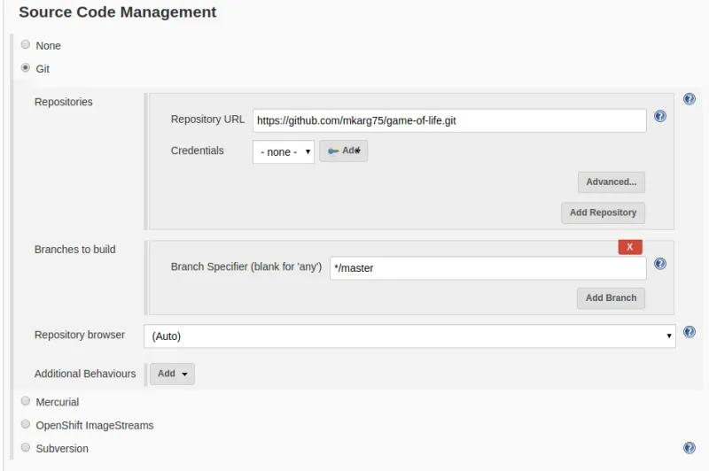 We’re using a fork of the Game of Life example (https://github.com/wakaleo/game-of-life). Let’s setup a maven project for our build in the Jenkins UI, using the ‘New Item’ button: