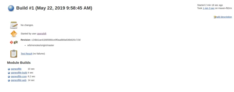 The times above do not include the time it took to download all the required libraries to the maven slave pod. The overall time spent on the build can be found in the right top corner, in my case that’s been 1 minutes 3 seconds. The majority of the time is spent on downloading libraries.