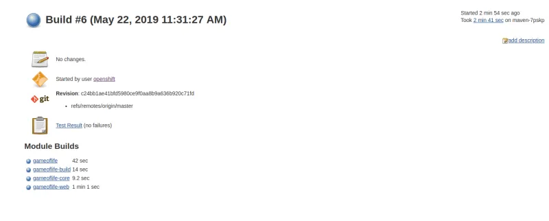 With a persistent volume attached to every maven pod that gets created, we should see a decrease in the overall time it takes to build our Game of Life project, just not for the first run. You may ask why. The answer is simple: the first run looks identical to our previous runs, it will have to pull down the dependencies for all consecutive runs. So let’s kick off that build and see how long it will take.